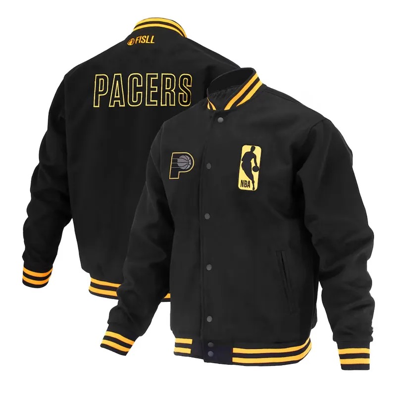 The Indiana Pacers Logoman Shadow Black Varsity Jacket reflects the proud basketball tradition of Indiana, blending classic varsity influence with the Pacers’ deep-rooted NBA identity.