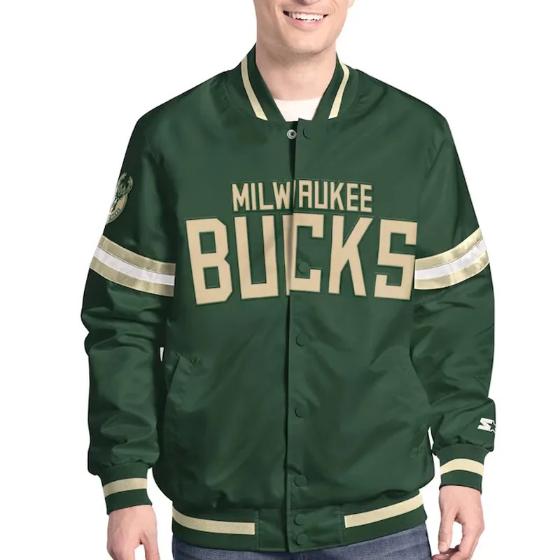 The Milwaukee Bucks Scout Varsity Satin Jacket celebrates the proud basketball legacy of the Bucks with timeless varsity styling inspired by classic NBA team fashion.