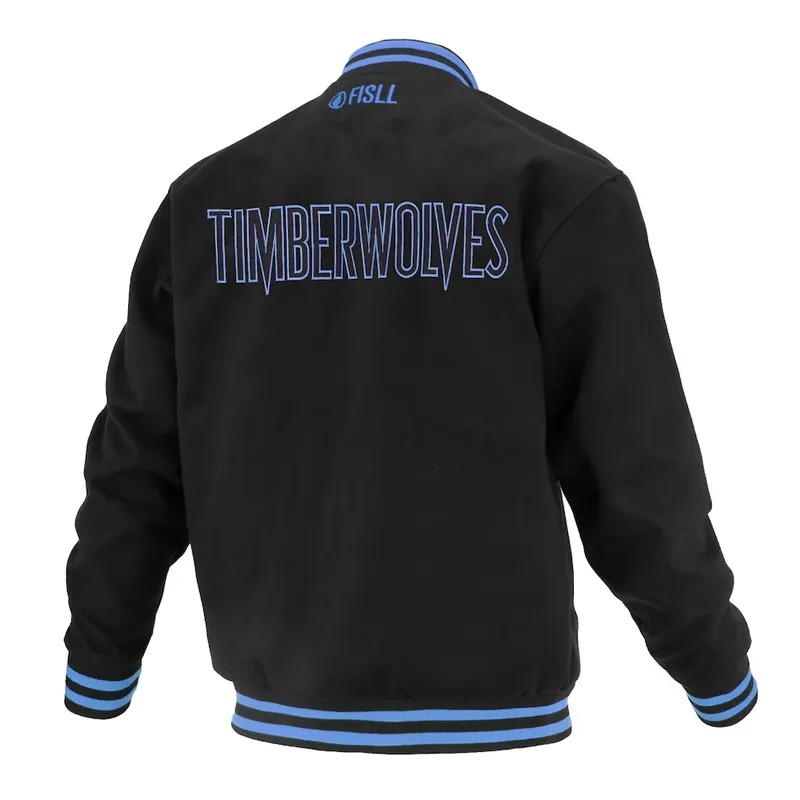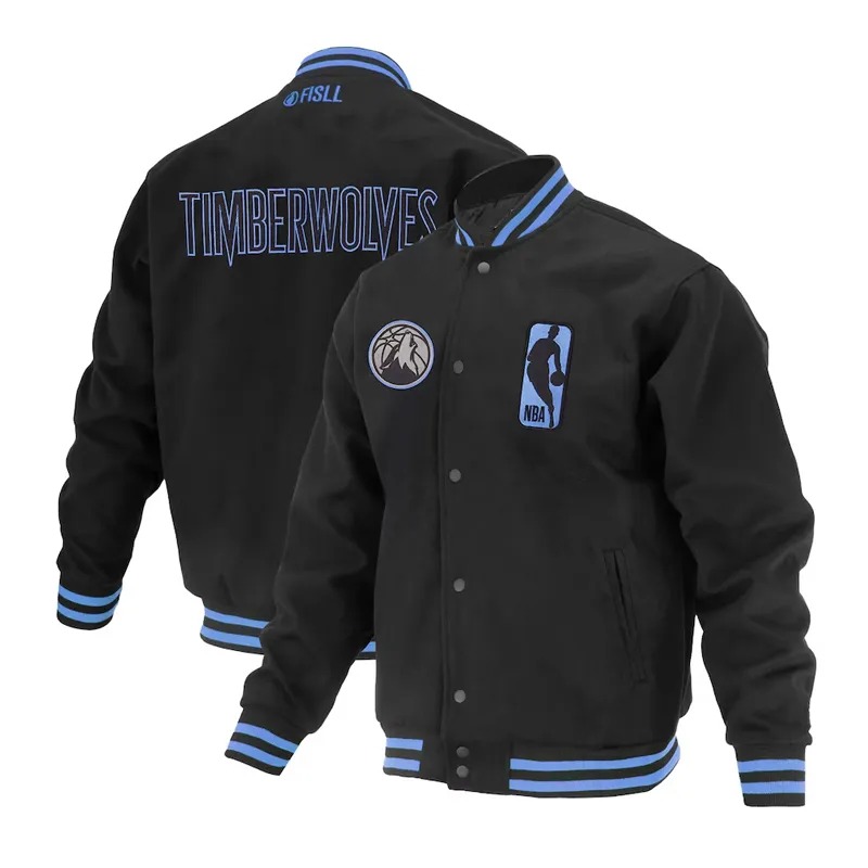 The Minnesota Timberwolves Logoman Shadow Black Varsity Jacket represents the journey of a modern NBA franchise, combining classic varsity tradition with the rising legacy of Timberwolves basketball.