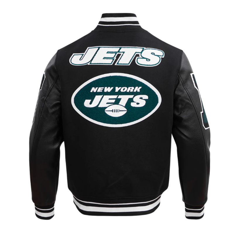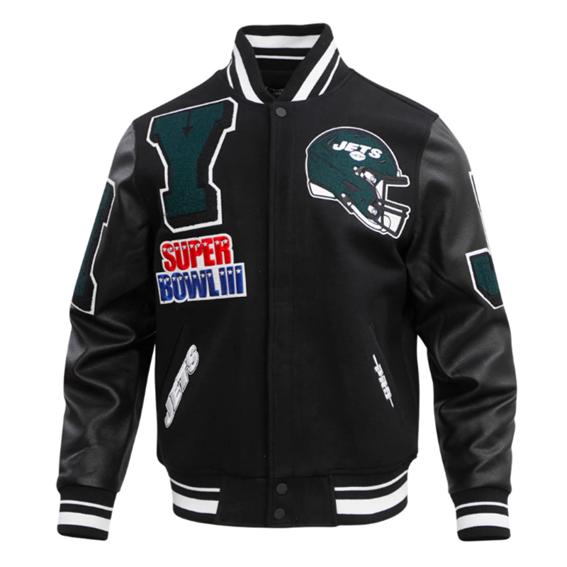 Show your Jets pride with the NY Jets Mashup Rib Varsity Wool/Leather Jacket. Perfect for game days or casual wear, this jacket celebrates the history and legacy of the New York Jets with a premium wool and leather design.