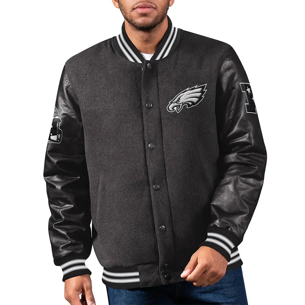 Show your Eagles pride with the Philadelphia Eagles First Rounder Black Varsity Jacket, a timeless piece inspired by the iconic varsity jacket style worn by NFL legends.
