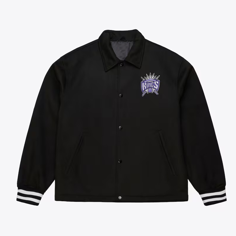 The Sacramento Kings Oversweep Black Varsity Wool Jacket showcases the bold identity and historic legacy of the Kings with a classic varsity wool design.