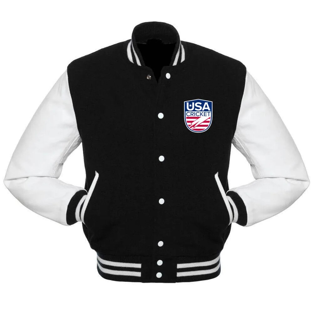 Show your support for the USA Cricket Team with this stylish black and white varsity jacket. Perfect for fans and players alike, it combines sporty design with a classic varsity look.